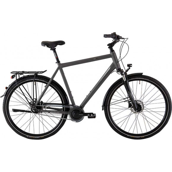 Rama: aluminium, męska, ze wzmocnionymi rurami Widelec: amortyzowany, Suntour NEX E25 ze wzmocnionymi sprężynami Biegi: Shimano Nexus 8-biegowy, wolnobieg Obręcze: aluminium, wielokomorowe, X17 Piasty: przód: Shimano dynamopiasta, czarna tył: 8-biegowa, wolnobieg Ogumienie: Continental Contakt Plus, czarne z odblaskiem Hamulce: Shimano MT200 tarczowe, hydrauliczne Oświetlenie: przód: AXA Compactline, 35 ls tył: AXA Slim Steady Dopuszczalna waga całkowita: 170 kg Waga: około 19,1 kg Kolor: ciemnoszary mat