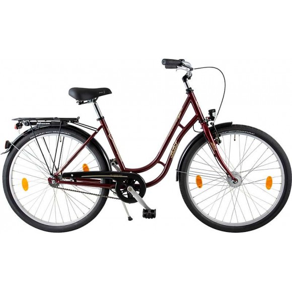 Rama: turystyczna, sportowa, stal, spawana Widelec: sztywny Biegi: Shimano Nexus 3-biegowy, torpedo Obręcze: aluminium, zwykłe, srebrne Piasty: przód: Shimano dynamopiasta, srebrna tył: 3-biegowa, torpedo Ogumienie: Impac Big Pac, czarne Hamulce: przód: V-Brake tył: hamulec pedałowy w piaście Oświetlenie: przód: Trelock Mini LS592 LED, z włącznikiem tył: AXA Spark lampka na bagażniku Dopuszczalna waga całkowita: 120 kg Waga: około 17,5 kg Kolor: bordowy