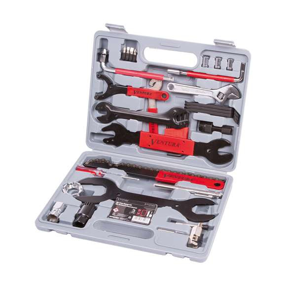 Zawiera: - klucze płaskie 0-21 / 13 / 14 / 15 / 16 / 17 mm - inbusy 1.5 / 2 / 2.5 / 3 / 4 / 5 / 6 mm - śrubokręt krzyżakowy - śrubokręt krzyżakowy-Bit - śrubokręt płaski - klucze zębate T25 & T10 - klucz do sterów 30/32 mm & 36/40 mm - klucz do szprych 10-15G - biczyk - klucz ściągacz do korb - klucz ściągacz do wielotrybów - zestaw łatek - łyżki do opon - nitownica do łańcucha