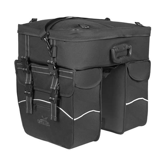 poliester 600D - kieszeń przednia na zamek błyskawiczny - sakwy zapinane na klamry z tworzywa sztucznego - elementy odblaskowe - wodoodporna - pojemność: około 34 litry (sakwy podwójne) - 25 litrowy kuferek z uchwytem do przenoszenia i paskiem na ramię - wymiary: torby podwójne 35x31x16 cm (2x) kuferek 35x47x15 cm - kolor: czarny