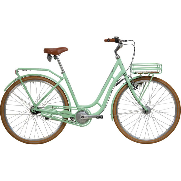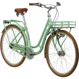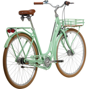 Rama: aluminium, turystyczna Widelec: sztywny Biegi: Shimano Nexus 7-biegowy, torpedo Obręcze: aluminium, wielokomorowe Piasty: przód: Shimano dynamopiasta, srebrna tył: 7-biegowa, torpedo Ogumienie: Schwalbe Road Cruiser Light, brązowe z odblaskiem Hamulce: V-Brake & pedałowy w piaście Oświetlenie: przód: Retro LED, 10 ls tył: Büchel Route 66 Dodatkowo: przedni bagażnik (szer. x dł. x wys.) 30,5 x 28 x 8 cm Dopuszczalna waga całkowita: 120 kg Waga: około 18,2 kg Kolor: miętowy